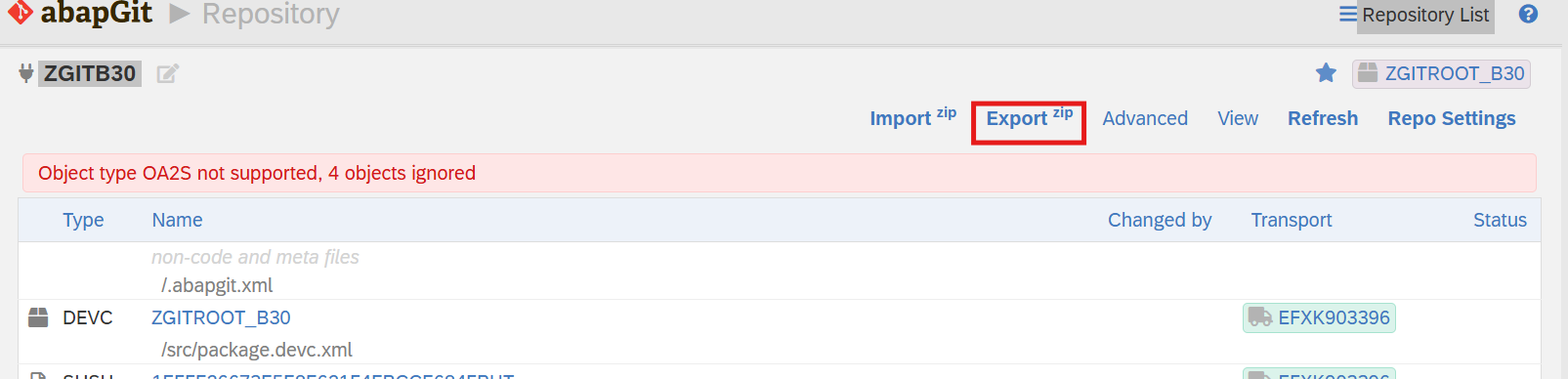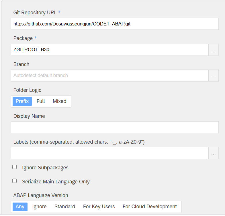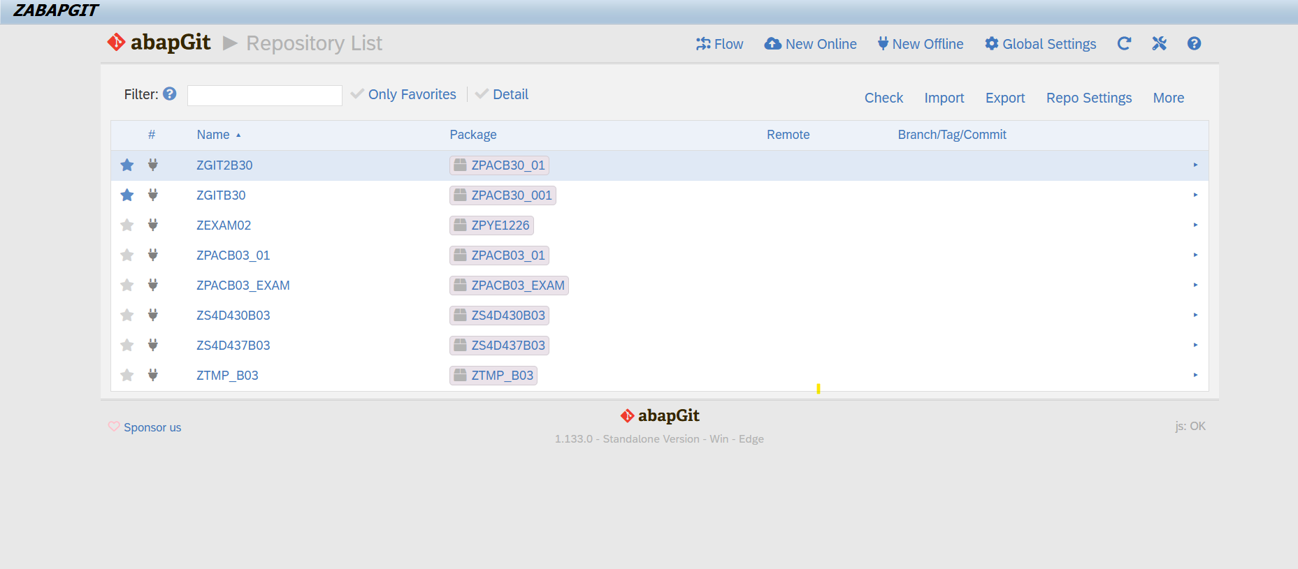 설치가 완료되면 SE38에서 ZABAPGIT 프로그램을 실행해 위와 같은 화면을 볼 수 있다.