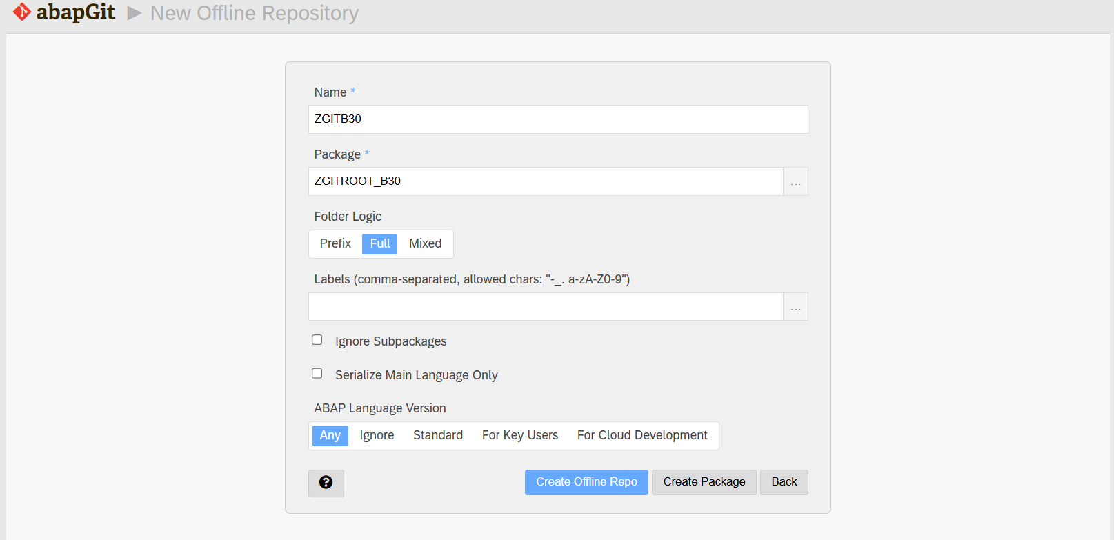 ABAPGit에서 Offline Repository를 생성한다. 이때 패키지들이 계층 구조로 얽혀 있으므로 Folder Logic을 반드시 Full로 선택해야 한다.